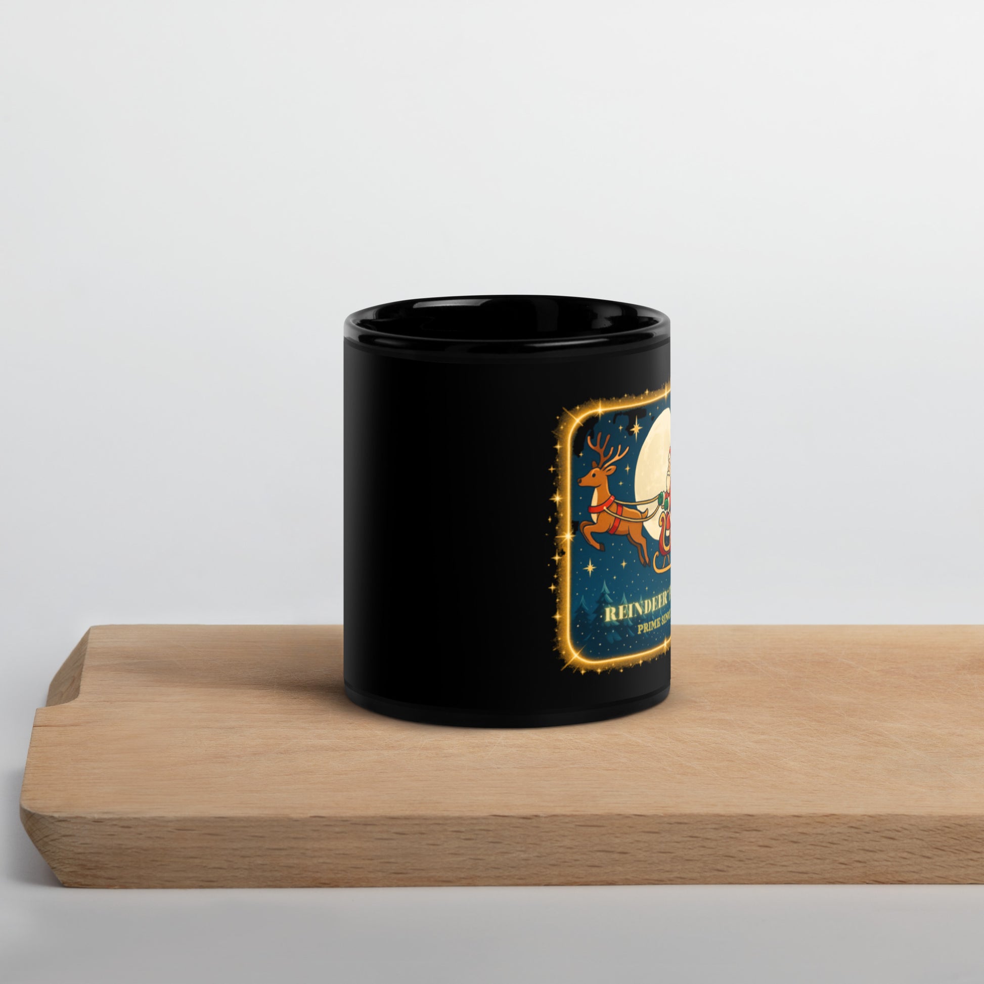 Somewhere between the smell of cinnamon sticks and twinkling lights, the Reindeer Express is right on schedule. This glossy black mug celebrates the magic-hour dash of Santa and his trusty reindeer, framed in a golden sparkle that makes every sip feel like curtain-call cocoa.