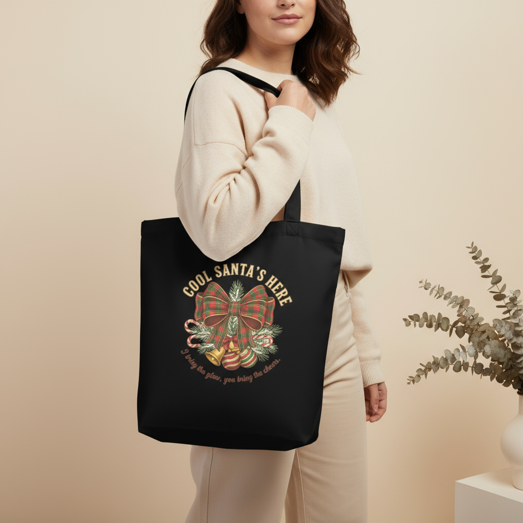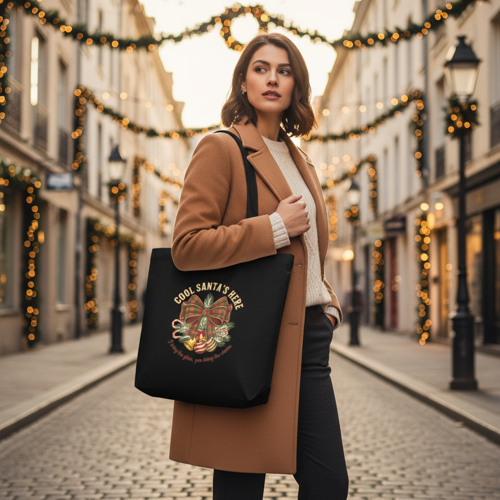 Walk into the holiday party and your tote does the talking: “Cool Santa’s Here.” The tartan bow, candy canes, bells, and pine say festive without shouting, so you look polished in every photo.