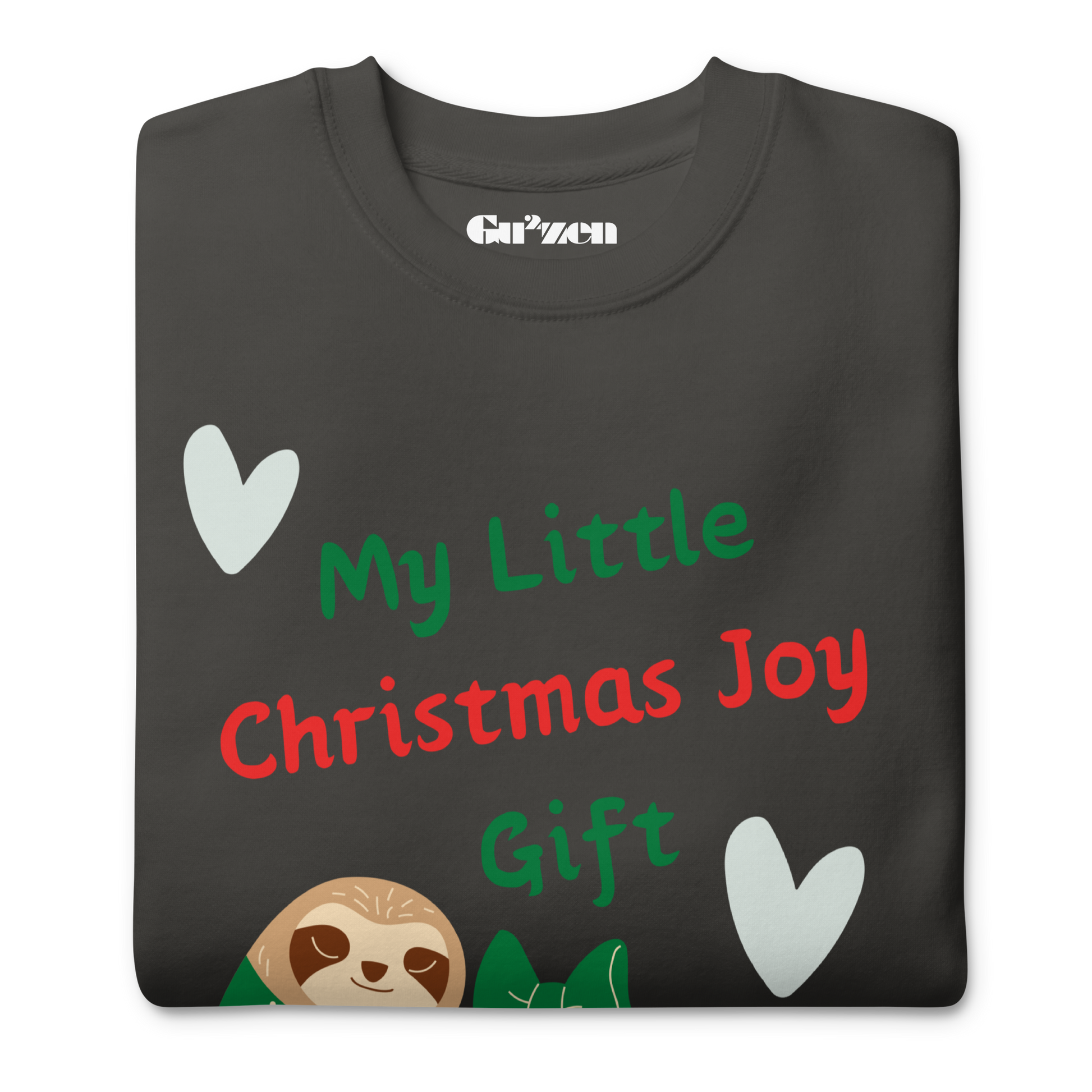 Some nights want warmth more than sparkle. This sweatshirt brings both: a plush feel and a cheerful sloth cuddling gifts under the words “My Little Christmas Joy.” The idea began with the cutest scene—sloths hugging trees—and we reimagined that tenderness for December, letting the hug land on your presents (and your day).