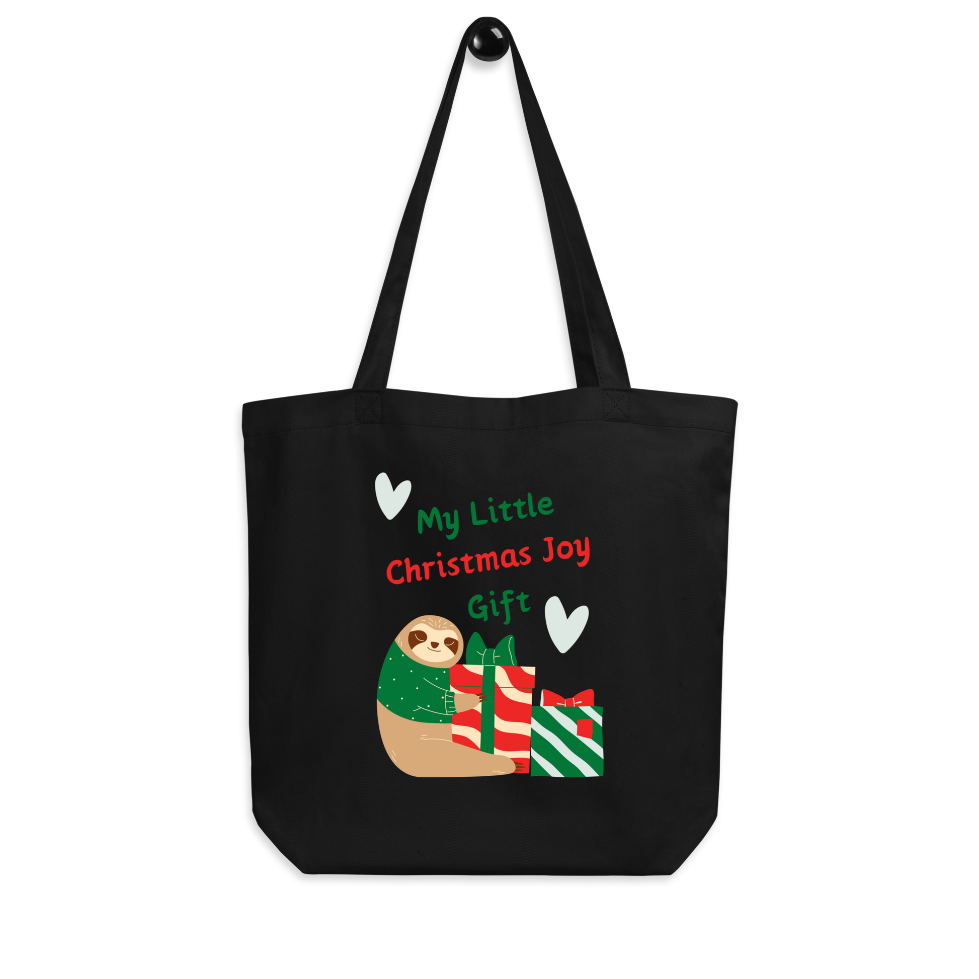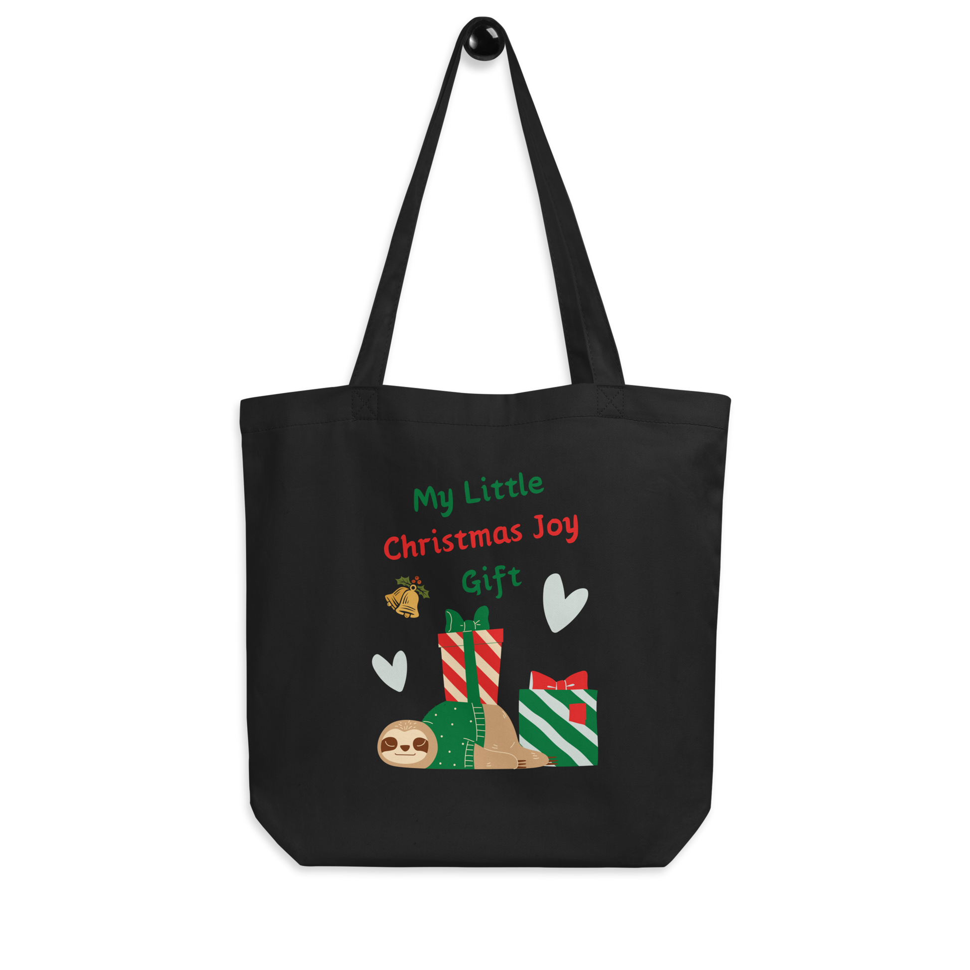 Holiday to-do lists are long; your pace can stay delightfully slow. This black Christmas tote turns every errand into a small celebration—thanks to a cozy sloth hugging a tower of presents beneath the playful line “My Little Christmas Joy Gift.”